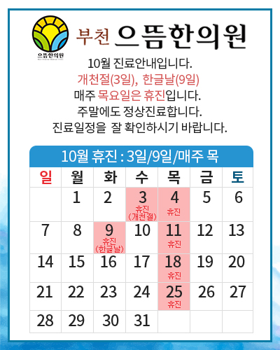 추석연휴 안내 9/23(일)~9/27(목) 휴진 *9/28(금)부터 정상진료합니다.