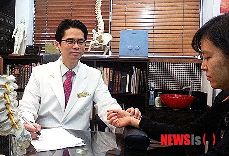 【부천=뉴시스】최한규 기자 = 19일 오전 경기도 부천시 오정구 원정동 으뜸한의원에서 한의학 박사 박지영 원장(35)이 교통사고 후유증인 어혈성 통증 환자를 진료하고 있다.