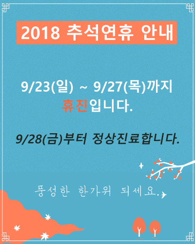 추석연휴 안내 9/23(일)~9/27(목) 휴진 *9/28(금)부터 정상진료합니다.